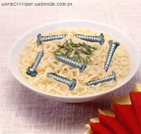 Em uma panela coloque o macarrão espaguete e os parafusos enferrujados, jogue a água e deixe cozinhar durante 6 horas e 37 minutos. Em quanto isso corte o tomate em rodelas e jogue na panela junto aos outros ingredientes. Quando as 6 horas e os 37 minutos passarem, desligue o fogo com cuidado e exprema o suco de tanjerina sobre o prato.