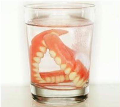 Coloque a dentadura ou a ponte movél em repouso por um dia dentro do copo. No dia seguinte, se preferir, tire a dentadura de dentro do copo coloque os cubos de gelo e decore com uma rodela de limão.